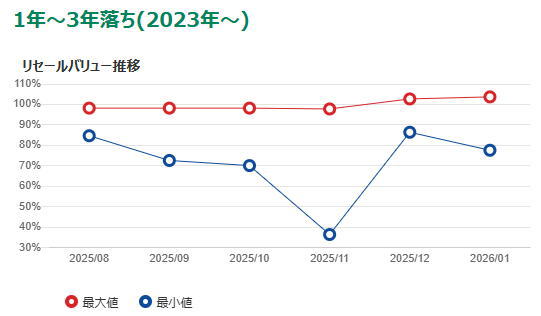 実際、ガリバーが公表するヴェルファイアのリセールバリュー情報(2026年1月時点の最新情報)をみると、2025年に入ってからリセールバリューは100%を超えており(最小値でも80%以上)、平均値よりも価値は上昇しているのがわかります。
